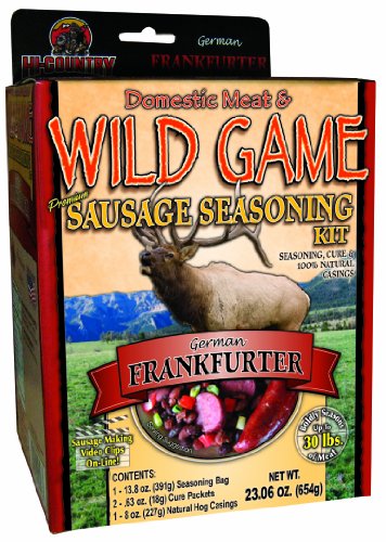 Everything you need to turn your wild game into 'GOSH DARN GOOD' dinner sausage! Our German Frankfurter flavor is a custom formulated combination of: Salt, Spices, Sugar, and Natural Flavor. Boldly seasons up to 30 lbs of meat! Each kit contains commercial grade ingredients, spices, cure, and 100% natural hog casings. Hi-Country's seasonings are custom formulated to be right on target & give you the best tasting, homemade sausage around. Use with wild game, domestic meat, or a combination of both! Since 1976 Hi-Country has been producing premium grade meat snacks under USDA inspection and the continued lieadership of Hi-Country's founder and president, Jim Johnson. At last, Jim has decided to begin sharing some of his best kept meat processing secrets and recipes with the public. -- Jim's long time love for the outdoors and his extensive knowledge of the meat industry has made it a natural choice for Hi-Country to become deeply involved with the creation of a consumable products line that the home meat processor can use to successfully make high-quality wild game, bird, and fish value added products. -- Hi-Country has graphically and functionally designed these products to project the spirit of more fully utiliizing the wide game harvested each season by hunters and fishermen.
